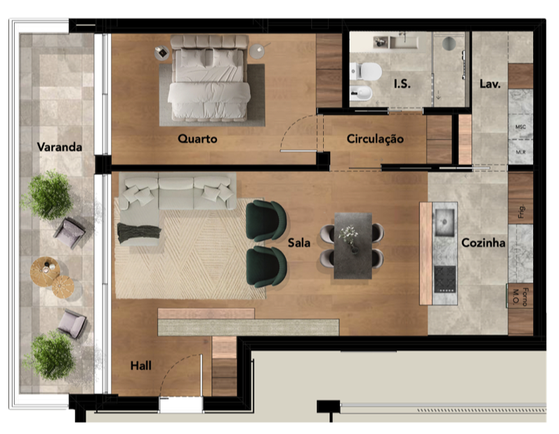 Portas em madeira, com bandeira fixa até ao teto. Puxadores do tipo Tupai, com fechadura sem chave, roseta circular, cor titânio e dobradiças ocultas. Rodapé embutido em madeira ou à cor do revestimento.