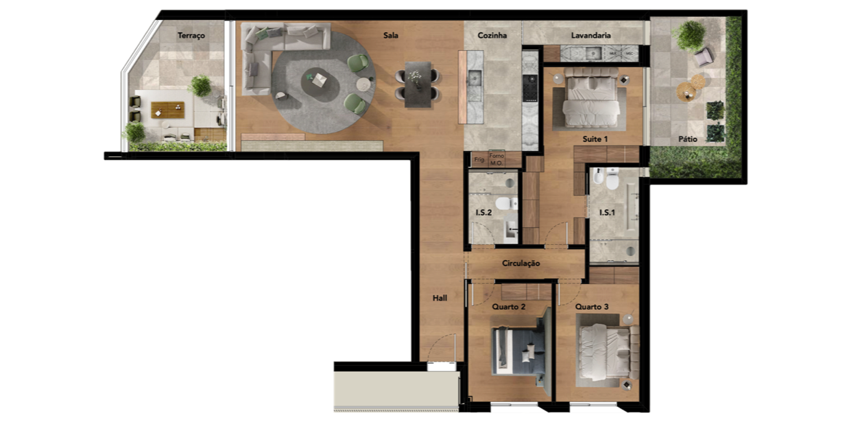 Áreas interiores: Sala / Cozinha 56,2 m2 | Suite 18,6 m2 | Quarto 2 12,8 m2 | Quarto 3 13,8 m2 | I.S. 1 6,2 m2 | |.S. 2 4,7 m2 | Lavandaria 6,0 m2