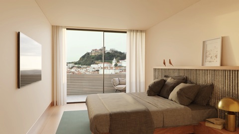 Roupeiros com portas em madeira, com puxadores salientes na mesma cor. Apontamentos de contraste entre acabamentos mate e acetinado. Suite com ligação directa à varanda com vista panorâmica sobre o Castelo de Leiria