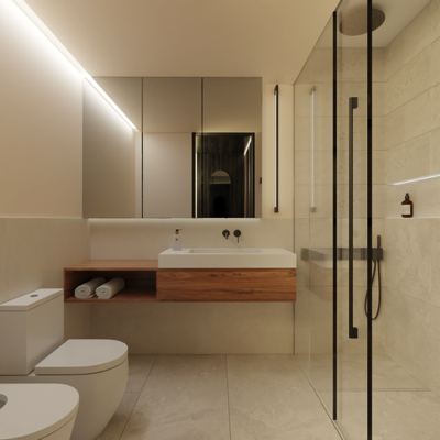 Casa de Banho com mobiliário com acabamento em madeira. Bancadas e lavatórios em solid surface, em tonalidades bege ou cinza. Torneiras em tons titânio ou latão escovado. Revestimento de paredes em cerâmicos de grandes dimensões e pintura para ambientes húmidos. Pavimento em cerâmico com peças de grandes dimensões em tonalidades bege ou cinza. Loiças sanitárias bege, caleira de duche de pavimento e cabine em vidro.